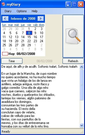 Tiene algunas opciones añadidas como un buscador y un botón para insertar la hora. Para asegurar la privacidad, el diario se protege con una contraseña.